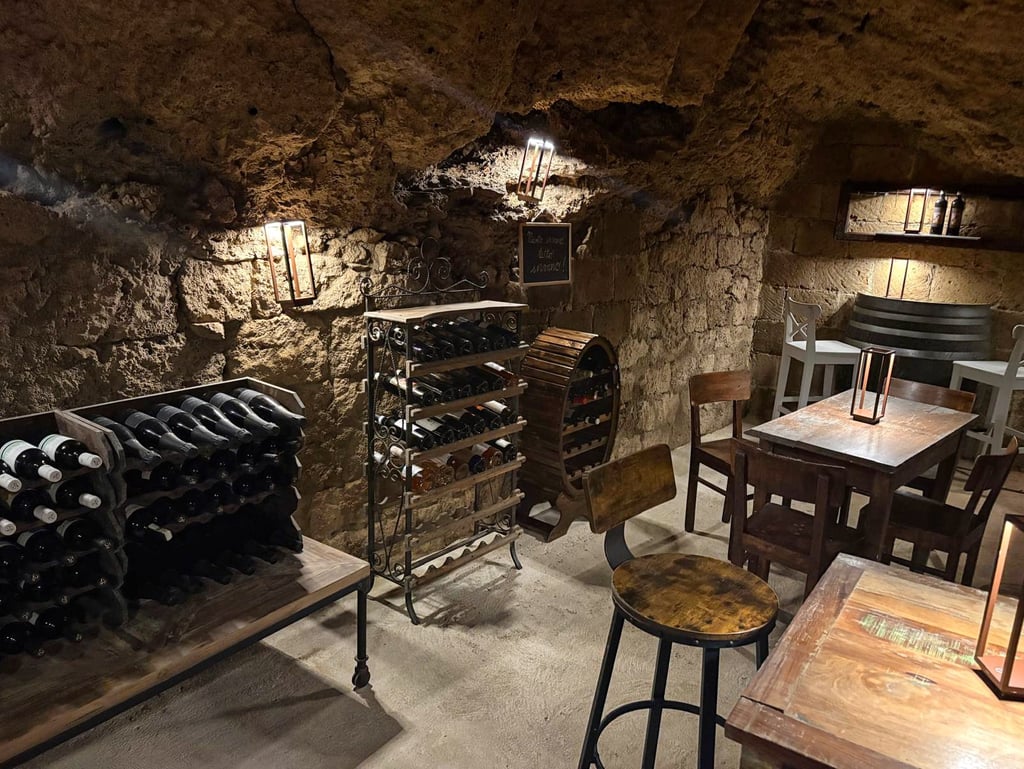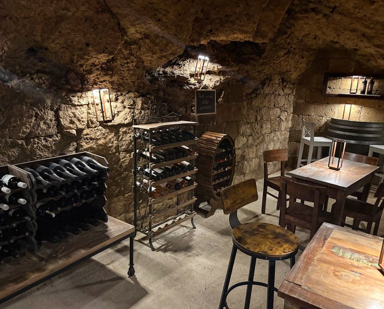 Una cantina scavata nella roccia, tra bottiglie selezionate, legno e pietra viva: uno spazio riservato esclusivamente agli ospiti per degustazioni lente e momenti da ricordare.