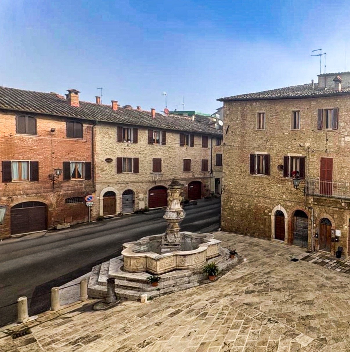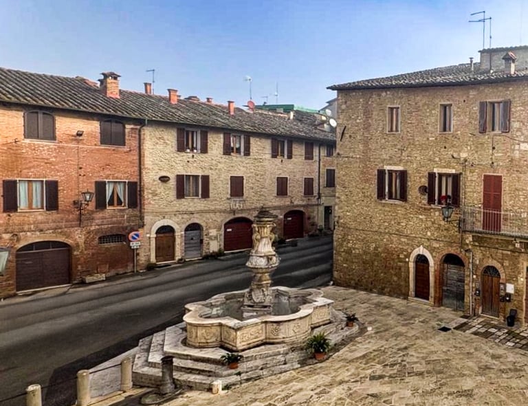 Affaccio diretto su Piazza del Grano, uno degli scorci più suggestivi di Asciano, un tempo cuore del mercato del grano e delle attività mercantili medievali. La piazza è dominata da una fontana quattrocentesca in travertino, realizzata nel XV secolo dallo scultore Antonio di Paolo Ghini, ricca di bassorilievi simbolici e decorazioni artistiche che raccontano la storia del borgo.