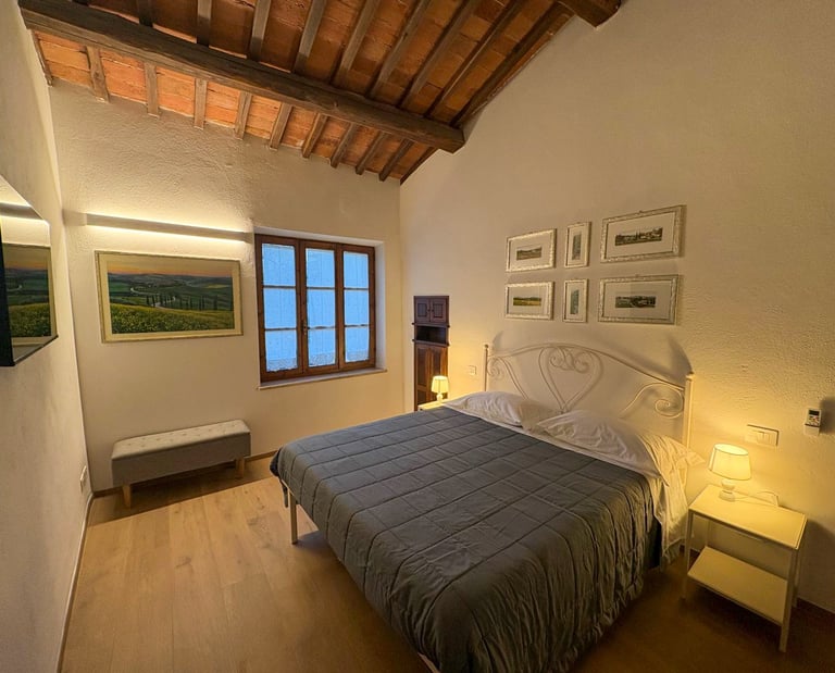 Due camere matrimoniali accoglienti, caratterizzate da travi in legno a vista e arredate con letto e armadio in ferro battuto, in perfetto stile toscano. Gli ambienti, caldi e rilassanti, sono pensati per offrire comfort e tranquillità dopo una giornata alla scoperta del territorio. Un’atmosfera autentica e curata, dove materiali tradizionali e funzionalità moderne si incontrano per garantire un soggiorno piacevole e rigenerante.