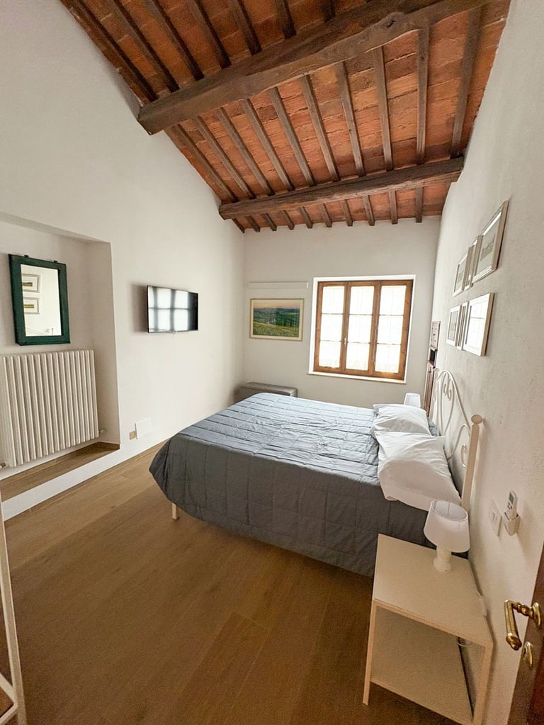 Le travi in legno a vista sul soffitto donano calore e carattere agli ambienti, creando un’atmosfera intima e raffinata.