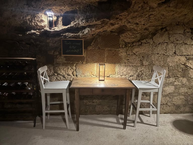 All’interno della struttura si trova un luogo unico e suggestivo: una grotta privata adibita a cantina, uno spazio autentico dove il tempo sembra rallentare e la pietra racconta storie antiche.